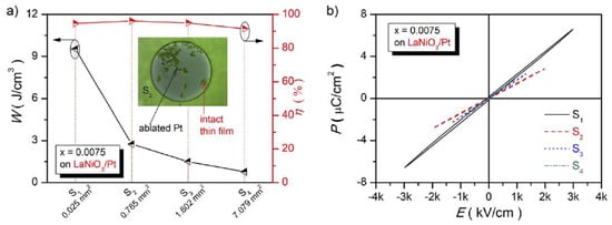 La-doped BCZT thin films at x = 0.0075 on LaNiO3/Pt composite bottom electrodes. The area of top electrode as a function of W and η. Inset: image of Pt top electrode (a). Polarization-electric field (P-E) loops with various sizes of Pt top electrodes (b). Reprinted with permission from [62]. Copyright 2019 Elsevier.