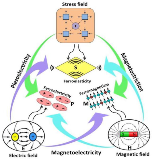 Schematic illustration of magnetic-elastic-electric couplings in multiferroic materials. Here, M is magnetization, S is mechanical strain, and P is dielectric polarization. Reprinted with permission from [103]. Copyright 2019 MDPI Publishers.
