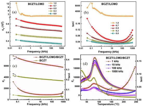 Room temperature frequency dependence of εr (a) and tanδ (b) for the (1−x)BCZT-xLCMO laminated composites and frequency (c) and temperature dependence (d) of εr and tanδ for BCZT-LCMO-BCZT composite. Reprinted with permission from [121,122]. Copyright 2017 Elsevier and 2019 AIP Publishing.