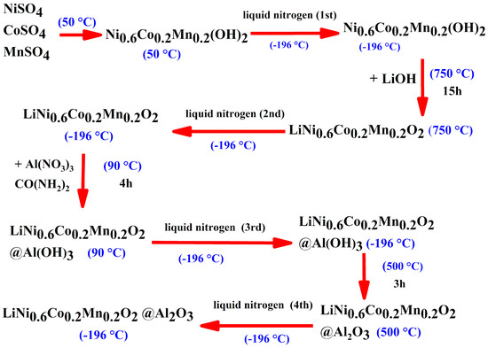 To synthesize the 1% Al2O3 coated LiNi0.6Co0.2Mn0.2O2 powder, a specified amount of CO(NH2)2 was added into deionized water to form a 1.0 mol/L solution. First 10 g LNCM 622-LN and 0.736 g Al(NO3)3 was added into deionized water and stirred at 90 °C for 30 min before adding into 2.0 mL of CO(NH2)2 solution and stirring for 4 h. After 4 h, the solution was poured into liquid nitrogen quickly and the temperature cooled down rapidly from 90 °C to −196 °C in 1 min; the 3rd liquid nitrogen quenching, for LiNi0.6Co0.2Mn0.2O2@Al(OH)3). Sixty min later, the Al(OH)3 coated LiNi0.6Co0.2Mn0.2O2 powder was washed with deionized water and dried at 80 °C. Then this sample was heated at 500 °C for 3 h. After 3 h was over, the powder (at 500 °C) was taken out of the oven immediately, rapidly poured into liquid nitrogen and cooled down rapidly from 500 °C to −196 °C in 1 min; the 4th liquid nitrogen quenching, for LiNi0.6Co0.2Mn0.2O2@Al2O3). Now we obtained the 1% Al2O3 coated LiNi0.6Co0.2Mn0.2O2 powder, as shown in Figure 2c, marked as LNCM 622-LN@Al2O3.