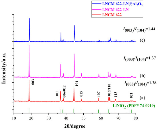 XRD patterns of LNCM 622 (a), LNCM 622-LN (b), and LNCM 622-LN@Al2O3 (c).