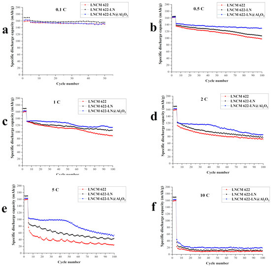 Cycling performance of LNCM 622, LNCM 622-LN and LNCM 622-LN@Al2O3 at 0.1 C (a), 0.5 C (b), 1 C (c), 2 C (d), 5 C (e), and 10 C (f).