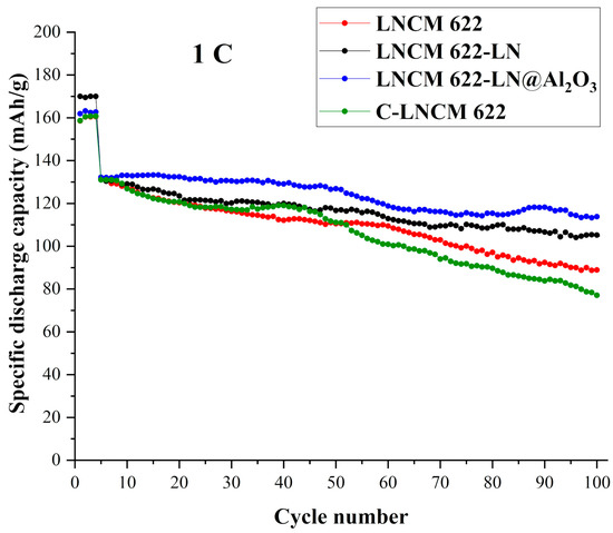 Cycling performance of LNCM 622, LNCM 622-LN, LNCM 622-LN@Al2O3, and C-LNCM 622 at 1 C.