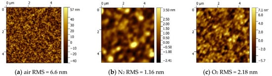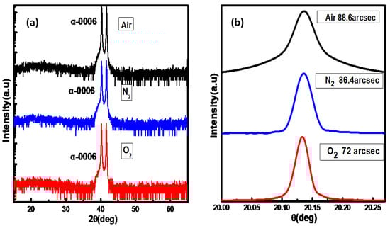 Raman spectra of the epilayers grown with air, N2, and O2 as the carrier gases were measured between 100 cm−1 and 800 cm−1 at room temperature to confirm the crystalline quality of the deposited films, and the results are presented in Figure 2. A 514 nm laser was used as the excitation source and the laser beam was focused by a microscope lens system (×50 ulwd) yielding a spot size of 1 μm during the Raman measurement. The Raman peaks at 418 cm−1 and 749 cm−1 belong to the sapphire substrate []. The Raman peaks located at 431.3 cm−1, 577 cm−1, and 692 cm−1 are the Raman-allowed vibrational modes of Eg, A1g, and Eg for α-Ga2O3, respectively, and are consistent with the theoretical calculations []. The high-frequency A1g mode at 577 cm−1 mainly involves the vibration of oxygen atoms perpendicular to the c-axis. The linewidth of the peak A1g is as narrow as 3.9 cm−1 for the epilayer grown with O2 as the carrier gas, strongly suggesting the high crystallinity of the epilayer. By comparing the epilayers grown with different carrier gases, the displacement and intensity of the Raman peaks do not change obviously, demonstrating that the stress in the films is mainly determined by other factors, such as lattice mismatch or growth temperature, instead of the carrier gases. It could also be observed that except the Raman peaks of α-Ga2O3, no other peaks are observed in the Raman spectra, which indicates that all of the epilayers are pure α-Ga2O3 without other phases and confirm the conclusion from the XRD measurements.