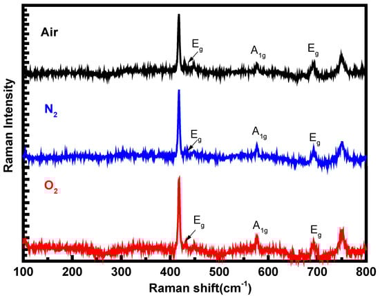 Raman spectra of the α-Ga2O3 epilayers grown with air, N2, and O2 as the carrier gases.