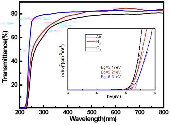The variation of optical transmittance spectra (200–800 nm) were performed on α-Ga2O3 films as shown in Figure 3. All the samples exhibited a transmittance higher than 80% in the visible to near-UV regions. The relationship between the absorption coefficient α and the optical bandgap (Eg) is αhν = A(hν−Eg)1/2, where A is the material-dependent constant, h is the Planck’s constant, and ν is the frequency of the incident light []. The optical band gap can be evaluated from the (αhν)2 versus photon energy (hν) graph by linear extrapolations to zero absorption coefficient []. The inset shows the plot of (αhν)2 as function of photon-energy hν. The bandgaps of the obtained materials remained at 5.1–5.3 eV, which is obviously larger than that of β-Ga2O3. The larger bandgap than that of β-Ga2O3 is obviously attributed to the crystal structure of α-Ga2O3 being different from β-Ga2O3. We note that the α-Ga2O3 sample grown with O2 as the carrier gas is dropped more abruptly than those of air and N2 in ultraviolet region. This phenomenon may be caused by less defect in α-Ga2O3 samples carried by O2. During the film growth, extra oxygen will ensure the ideal ratio of O to Ga atomic, which results in higher crystalline quality and leads to its bandgap being close to the ideal value of 5.3 eV. The higher crystalline quality for the sample with O2 as the carrier gas is consistent with the XRD measurement results.