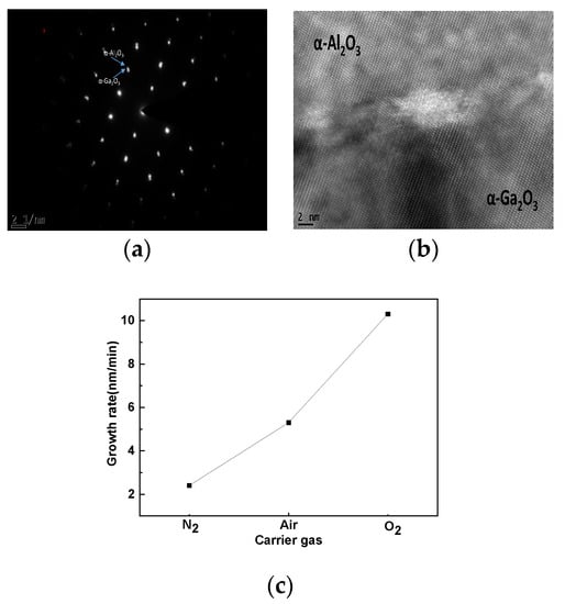 TEM images. (a) Diffraction spots of α-Ga2O3/α-Al2O3 for the sample with O2 as the carrier gas, (b) cross-sectional α-Ga2O3/α-Al2O3 interface for the sample with O2 as the carrier gas. (c) Growth rate of α-Ga2O3 films grown by air, N2 and O2 carrier gas.