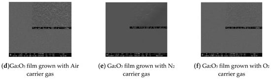 AFM surface images of Ga2O3 films grown with different carrier gases: (a) air (b) N2, and (c) O2. SEM pictures for the Ga2O3 films grown with different carrier gases: (d) air (e) N2, and (f) O2.