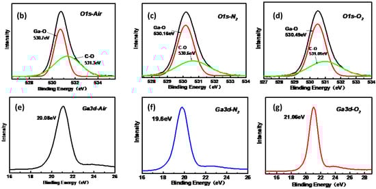To assess the elemental composition of the α-Ga2O3 films, XPS measurements were conducted for the epitaxial films on sapphire. The result for the sample with O2 as the carrier gas is presented in Figure 6a and only three elements (C, Ga, and O) are observed in the films. The position of the Ga 2p3/2 and Ga 3d binding energy peaks confirms the presence of Ga2O3 []. It can be observed from the spectra that the Ga2p3/2 and Ga2p1/2 signal peaks are located at 1118.5 eV and 1145.5 eV respectively, The energy difference between the two signal peaks is about 27 eV, which is consistent with the Ga2p signal peak energy difference reported in the literature []. The binding energy position of Ga3d signal is 21.05 eV, which is consistent with the results reported in the literature []. The result for the samples with air as the carrier gases is shown in Figures S3 and S4. The same peak positions appear in both samples and no significant peak shift and peak intensity changes are observed, indicating the same pure α-Ga2O3 and correspond to the XRD and Raman results. Figure 6b–d show the peaks of O 1s signal around 530.6 eV for the three samples. O 1s signal peaks do not show Gaussian symmetry so Gaussian fitting was carried out for the peaks. It is found that the strong O 1s signal peaks appear at 530.6 eV and 532.1 eV. The peak at 530.6 eV originated from the oxygen element in Ga–O bond, while the peak at 532.1 eV originated from the adsorption O on the sample surface []. Figure 5e–f show Ga 3d spectra. The chemical compositions of the surfaces were determined from the area of the Ga 3d, O 1s, and C 1s peaks taking into account the corresponding sensitivity factors []. The calculated atomic ratios of O to Ga for the samples grown with air, N2, and O2 as the carrier gases were 1.53, 1.51, and 1.56, respectively. It reveals that more oxygen present in the carrier gas can slightly increase the O content of the film, which confirms the guess in the XRD measurement.