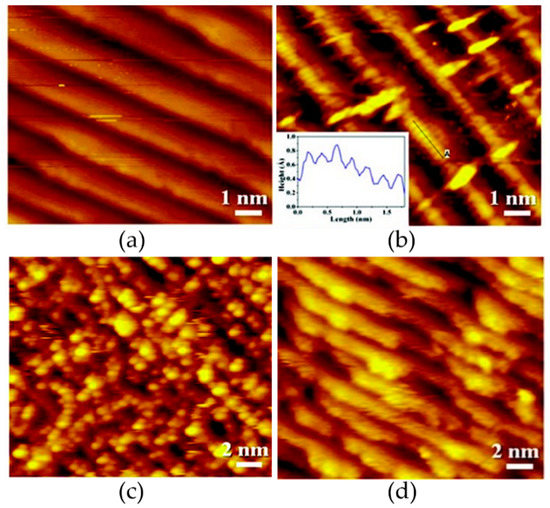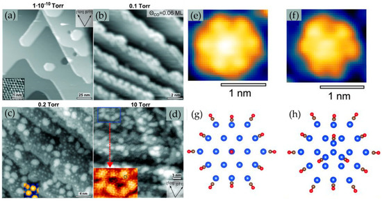 With the change of gas content on the metal crystal surfaces, the restructuring process on crystal surfaces produces different effects. Zhu et al. observed nanometer-sized clusters after exposure to oxygen, which were detected by STM distinctly, as shown in Figure 1, and identified as Pt surface oxides by AP-XPS [29]. The nanometer-sized clusters gathered on Pt(557) at 1 Torr of O2 at room temperature (RT) (Figure 1b). These clusters firstly manifested as 1D chain structures at the step edges. With the gradual increase of exposure time, the chains progressively formed nanometer-sized clusters centered on step sites (Figure 1c). At last, the clusters disappeared on the crystal surface after evacuating O2 to UHV (Figure 1d). The experiment is highly repeatable, which ensures the accuracy and authenticity of the experiment results [29]. Besides, surface reconstruction can be promoted by adsorption and chemical reactions. Unsaturated sites with different contents facilitate surface cluster formations and step coalescence as a result of molecule adsorption. Liu et al. found a reconstruction of a 1 × 1 structure to a 2 × 1 structure on the ZnO () surface under the introduction of H2 [30], resulting from the hydroxylation of the surface. Previous studies have shown that H2O adsorption can also lead to hydroxylation of the ZnO () surface, and STM studies have proven that 2 × 1 reconstruction occurred at the same time due to the alternating distribution of H2O molecular and dissociation states [31]. According to comparative experiments and analyses, authors ruled out that the same experimental results were not caused by trace amounts of H2O in H2. Instead, they considered that the dissociation and adsorption of H2 was capable of contributing to the reconstruction of ZnO (). Consequently, we can conclude that many factors exist in metal reconstruction.
