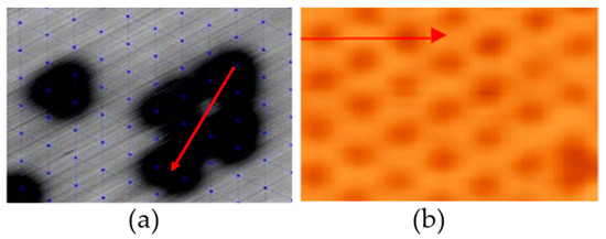Interestingly, the same O/Pd (111)-2 × 2 system characterized by STM may present different images, as seen in Blanco et al. A Pd (111) surface with low coverage of oxygen atoms is presented in Figure 2a, which is deposited by thermal dissociation of a layer of adsorbed molecules from 60 to 160 K, inducing 2 × 2 ordering islands [32]. As a comparison, the Pd (111) surface is covered by a monolayer of oxygen atoms while being exposed to O2 at room temperature, as shown in Figure 2b. Another difference between the two sets of experiments is that a Pt tip under a low bias (V = 0.059 V and I = 16.9 nA) is used in the first system, while an Ir tip under a high bias voltage (V = 1.4 V and I = 0.7 nA) is used in the second one. Compared with Figure 2b, the substrate Pd can be clearly seen in Figure 2a. The oxygen atoms adsorbed on hollow fcc sites formed a triangle on the Pd surface and produced a depression. In Figure 2b, the oxygen atoms are imaged as protrusions, which spread over the entire Pd surface in the form of connected circles. Blanco et al. considered that the corrugation along the relevant scan line matters, it also has been predicted that the STM images rely heavily on the relative corrugation heights of the top or hcp positions along the scan line according to the calculations and experimental data [6]. In consequence, the main reason that leads to the difference between Figure 2a,b is the different corrugation heights of the top position and that of the hcp sites by using different tips and voltages. When the corrugation height of the top position is higher than that of the hcp site, a triangular shape is obtained. When it comes to the same corrugation height, the shape of the oxygen depression becomes circular. When the corrugation height of the top position is lower than that of the hcp site, the triangular shape reappears but is inverted relative to the one of Figure 2a.