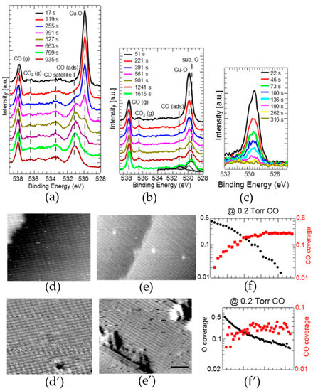Eren et al. also carried out several studies of CO oxidation on low-index Cu surfaces with a pre-adsorbed oxygen layer, in contrast to experiments under UHV [65]. As can be seen in Figure 5a–c, there were two O-containing species: a peak of chemisorbed O at 529.9 eV and another of molecularly adsorbed CO at 531.0 eV that changed over the reaction time. The intensity of the adsorbed CO peaks became gentler, and that of the chemisorbed oxygen peaks became sharper. It can be inferred that the chemisorbed oxygen was gradually replaced by the adsorbed CO during the reaction process. As proposed in previous literature, oxygen atoms on Cu(110) form 2 × 1 structures, mentioned as an “added-row structure” with 0.5 monolayer coverage. It produces 2 × R45° (“missing-row”) structures on Cu(100) with 0.5 monolayer (ML) coverage. STM images of the Cu(110)-(2 × 1)-O surface and the Cu(100)-(2 × R45°)-O surface at RT in UHV and under 0.01 Torr CO pressure for about 1 h after CO introduction are shown in Figure 5d,d’,e,e’. With the increase of CO pressure to 0.2 Torr, the O-removal rate increased over time, while the 2 × 1 structures on the oxygen-covered regions of the surface remained unchanged according to STM and LEED (low-energy electron diffraction). Similar trends were found on the Cu(100)-(2× R45°)-O surface, which were still visible under 0.01 Torr of CO up to 1 h, indicating the reaction rate of CO + O2 was slow (Figure 5e,e’). The functional relationships between the absorbed oxygen and CO coverage on both surfaces converted from XPS peaks after introduction of 0.2 Torr CO and time are shown in Figure 5f,f’. The intensities of XPS peaks of O and CO are plotted as a function of time and pressure. The reaction rates of CO on the above three substrates are inferred as Cu(111) > Cu(100) > Cu(110).