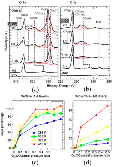 The functional Cu2O percentages of the surface converted from the O 1s and Cu 2p XPS peak intensity ratios and O2:CO pressure ratio are shown in Figure 6c. Cu2O increases with the temperature. Above 333 K, more than 80% of the surface is oxidized to Cu2O when the ratio of O2: CO is higher than 0.3. After pumping O2 out of the chamber, and only CO is left, no significant reduction from Cu2O to Cu is observed at least for more than 0.5 h when T ≤ 413 K. Functional O2:CO pressure ratios and Cu2O percentage on the near-surface region (IMFP ~1.7 nm) converted from near edge X-ray absorption fine structure (NEXAFS) data at the Cu L3 edge is shown in Figure 6d. It can be seen that there is more improvement in the depth of information than that in Figure 6c, but the general trend is still the same as that in Figure 6c [66].