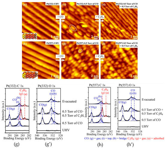 Similar to the case of oxygen pre-adsorption on copper, pre-adsorption of CO or alkynes on different Miller-indices of Pt is also a hot topic because of the outstanding catalytic performance of CO. According to published reports, ethylene adsorption and hydrogenation will be blocked when CO adsorbs first on Pt [70]. Zhu et al. demonstrated how different step geometry sites affects the reconstruction of stepped Pt(332) and Pt(557) under co-adsorption of CO and C2H4 gas mixtures at room temperature by HP-STM and AP-XPS [71]. Figure 8a,b reveals atomic images of Pt(332) and Pt(557) under UHV. The average widths of visible terraces were ~1.4 nm on both surfaces. A large number of clusters, roughly parallelogram in shape for Pt(332) (Figure 8c) or triangles for Pt(557) (Figure 8d), appeared on both surfaces when 0.5 Torr of CO was introduced at room temperature. Two of the clusters are enclosed by the white ellipses, as shown in Figure 8c,d. Peaks of the CO gas phase adsorbed at the top or bridge sites can also be observed in the corresponding AP-XPS spectra. In the presence of 0.5 Torr of CO, the CO coverage was estimated to be 0.88 ML on Pt(332) and 0.94 ML on Pt(557) according to relevant O 1s and Pt 4f peak areas. The content of CO changed after 0.5 Torr C2H4 was introduced. The concentration of clusters on Pt(332) distinctly decreased (Figure 8e), while it was unchanged on Pt(557) (Figure 8f). In supporting experiments, more clusters disappeared when the C2H4 pressure was further raised to 2.5 Torr, leaving the original 570 pm periodic clusters at the step edges. AP-XPS data changed accordingly after the introduction of 0.5 Torr of C2H4. Extra peaks of the C2H4 gas phase at ~286.0 eV and a small feature of ethylene adsorbate at ~284.1 eV appeared in the C1s spectra. The coverage of C2H4 estimated from C1s peak areas was 0.08 ML on Pt(332) and 0.05 ML on Pt(557), and the coverage of CO decreased to 0.80 ML on Pt(332) and 0.88 ML on Pt(557), indicating that C2H4 can adsorb on the Pt surface that has been pre-adsorbed by CO, by replacing CO molecules.