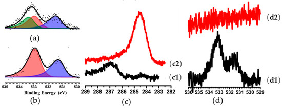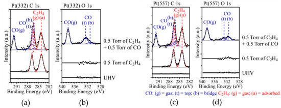 Experiments for how different sites of step geometry affect the reconstruction of stepped Pt(332) and Pt(557) are also carried out by reversing the sequence of CO and C2H4 exposures [72,73]. Extra addition of 0.5 Torr of CO does not give rise to significant cluster changes in STM images of Pt surfaces pre-adsorbed by C2H4. Figure 9 shows the C 1s and O 1s spectra of Pt(332) and Pt(557) surfaces under 0.5 Torr of C2H4 and after subsequent addition of 0.5 Torr of CO. In the presence of 0.5 Torr of C2H4, peaks of the C2H4 gas phase at ~286.2 eV and a small feature of ethylene adsorbates at ~284.2 eV matched the assignments in Figure 8. After introducing 0.5 Torr of CO, peaks of top-CO sites and bridge-CO sites appeared in the O 1s spectra at ~532.8 and ~531.3 eV, which indicates that CO can be accommodated on stepped Pt surfaces precovered by C2H4. At the same time, the gas peak of C2H4 decreased by 0.5 eV, which is due to the increase of sample work function, as evidenced by the red-shift of the C−O stretch in infrared spectroscopy. From the deconvolution of O 1s spectra in Figure 9c,d, it is distinctly noticed that CO mainly occupied top sites on Pt(332) and bridge sites on Pt(557). In conclusion, the influence of the Pt surface with different step geometries is not caused by small differences or the initial coverage of external gases, rather, it is a consequence of the peculiar structural (electronic and chemical) properties of the different step orientations of Pt(332) and Pt(557).