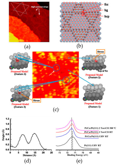 At this point, several comparable experiments were carried out in AP-XPS systems, in which Pt/Cu/Pt(111) was prepared with the same experimental parameters of evaporation as used in the HP-STM system. As shown in Figure 10e, the binding energy of Pt 4f of Pt/Cu/Pt(111) was 0.15 eV higher than that of pure Pt(111). The conclusions can be drawn as follows: the difference was due to the incorporation of Cu atoms of Pt/Cu/Pt(111) with a much smaller diameter than Pt atoms. The interaction of superficial surface layers of Pt/Cu/Pt(111) was weaker than those of pure Pt(111). No significant changes were observed between the binding energy of Pt 4f of Pt/Cu/Pt(111) under 2 Torr CO at RT and a clean Pt(111) in UHV at RT. Compared to Pt 4f of Pt/Cu/Pt(111) in 2 Torr CO at RT, a left-shift of 0.15 eV occurred again for Pt 4f of Pt/Cu/Pt(111) in 2 Torr CO at 573 K (Figure 10e). It can be reasonably speculated that the distribution of Cu atoms changed from UHV to 2 Torr CO environments, which is indeed consistent with the formation of Pt nanoclusters observed in HP-STM. It is proven that Cu atoms are capable of enhancing binding between surface Pt atoms and CO molecules [85] because Cu atoms could migrate to the surface and alloy with Pt atoms when Pt/Cu/Pt(111) NSA is exposed to 2 Torr CO at 573 K, even though it is known that the binding degree of Cu and CO is lower than that of Pt and CO.