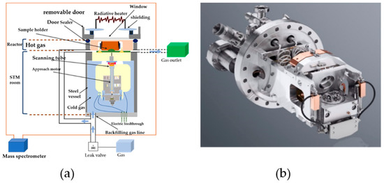 At the beginning, STM experiments can only be operated either an under ultra-high-vacuum (UHV, below 10−9 mbar) environment or in air (103 mbar) [10], whilst great success has been witnessed in revealing atomic structures and manipulating atoms on ideal crystal surfaces [11,12,13,14,15]. However, the UHV environment or in-air atmosphere does not match the reality of in situ reactions or operando conditions. Therefore, such a pressure gap needs to be bridged in order to investigate the changes and evolution of the surface morphology during reactions [9], and near-ambient pressure scanning tunneling microscopy (NAP-STM) (also called high-pressure scanning tunneling microscopy, HP-STM). As can be seen in Scheme 1, the heart of NAP-STM is the in-situ reaction cell [16], which holds the sample stage, heating facility, tip and scanning motors, and gas inlet system and is isolated from the main chamber. The reaction cell can be filled with reacting gas varying from 1 to 100 mbar during operando reactions, while the base pressure in the main chamber is maintained around 10−7 to 10−9 mbar depending on the differential pumping efficiency. By this means, any changes of nanostructures/defects/vacancies on the surface under operando conditions can be directly imaged, bridging the gap between model systems under the UHV environment and real catalytic reactions occurring in the field of chemical engineering [17].