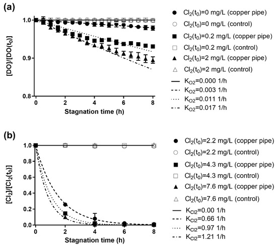 Consumption of dissolved oxygen (DO) and chlorine in new copper pipes during stagnation, the depletion of both oxidizing agents follows a first order kinetics rate law. (a) DO consumption during stagnation is significantly affected by the presence of chlorine in the range of concentration expected in drinking water (initial DO was 7.66 ± 0.10 mg/L). (b) Chlorine is depleted in about 4 h due to corrosion; no difference was observed in experiments with DO (initial DO was 7.48 ± 0.12 mg/L) and without DO (below detection limit of 0.10 mg/L). The error bars represent the standard deviation (n = 2). The control experiments of copper pipes (glass cylinders) are represented by the same (but empty) symbols.