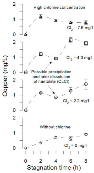 Although copper release increased with the initial chlorine concentration, our results suggest that for higher chlorine concentration (greater than 4 mg/L) the increment reaches a maximum limited by the solid phase of Cu(II) that controls copper solubility. The current knowledge of copper corrosion thermodynamics proposes that soluble corrosion by-products released into the water from new copper pipes is controlled by the solubility of cupric hydroxide [39,40]. In fact, the solubility of cupric hydroxide under the experimental conditions (pH = 7.2, DIC = 80 mg as CaCO3 /L, 25 °C and 8 h of stagnation) was calculated to be 1.8 mg/L (asymptotic upper limit in Figure S1). It must be kept in mind that thermodynamic predictions do not provide information about the kinetics of copper corrosion by-products solubility, and that the thermodynamic equilibrium is not expected at 8 h of stagnation [42]. Thus, it is reasonable to expect copper concentrations lower than 1.8 mg/L, in spite that some particulate corrosion by-products might be detached during sampling by shear stress, slightly increasing total copper measurements [24].