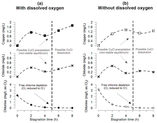 Mass balance during stagnation. A decrease in the copper concentration is reached at 4 h, probably because of Cu-Cl precipitation during the first hour of stagnation. The pipe experiments were conducted using water (a) with oxygen (7.59 ± 0.00 mg/L), and (b) without oxygen. Interestingly, in both cases, copper and chloride present a minimum concentration at the time that chlorine is almost completely depleted (0.02 ± 0.00 mg/L).