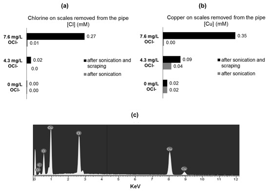 To identify the elemental composition and targeting elemental chlorine at different layers of corrosion, by-products T-XRF was used. T-XRF of the corrosion by-products extracted from the pipe coupons by sonication revealed that chlorine was negligible in detached particles, despite that copper scales were removed (Figure 4a–b). These findings support the presence of an external/superficial film of malachite, and not chlorine-content scales. In contrast, after coupon sonication and surface scraping, chlorine was found as part of the removed scales. Interestingly, the mass of chlorine released as Cu-Cl corrosion by-product particles increased together with initial chlorine concentration in water. These results suggest that chlorine is probably forming part of non-superficial or “deeper” (from solution to the metal) corrosion by-product layers (Figure 4a–b). Additionally, coupons extracted from tested pipes were embedded in epoxy resin. To observe and analyze the thin scales formed on the copper inner surface, the resin was completely removed from the coupon surface, extracting with it the corrosion by-products formed over the metallic surface. EDS analysis of the scale attached to the resin surface (coupon face) reveals the presence of chlorine in the attached corrosion by-products (Figure 4c). These results confirm the presence of elemental chlorine in “deeper” corrosion by-products layers.