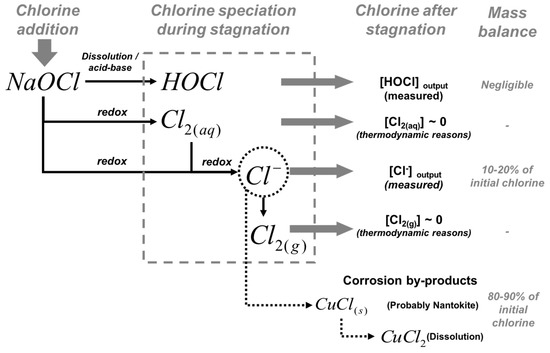 Speciation of free chlorine during stagnation. According to thermodynamic consideration and a mass balance of chlorine within the pipe during stagnation, most of the reduced chlorine precipitates as corrosion by-products, probably nantokite (CuCl).