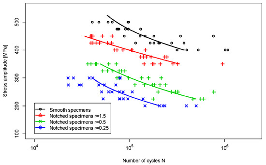 - Strzelecki, P.; Tomaszewski, T.; Sempruch, J. A method for determining a complete S-N curve using maximum likelihood. In Proceedings of the 22nd International Conference on Engineering Mechanics, Svratka, Czech Republic, 9–12 May 2016; Zolotarev, I., Radolf, V., Eds.; Institute of Thermomechanics of the Czech Academy of Sciences: Svratka, Czech Republic, 2016; pp. 530–533. [Google Scholar]