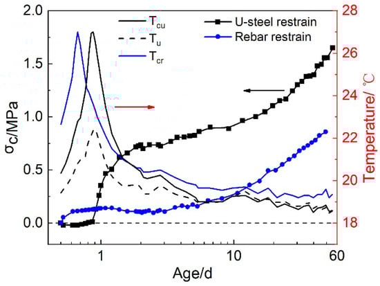 3.3.3. The Separation of Autogenous Shrinkage and Thermal Stresses Based on U-Steel Restrained Stress Test under Sealed Condition