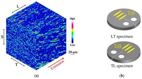 Prior work has demonstrated that the mechanical properties of stainless steels [15] and of alloys of magnesium [16], cobalt–chromium–molybdenum [17], and titanium [18,19,20,21,22,23,24,25,26,27,28,29,30] can all be improved via the addition of boron. The combination of titanium and boron generates whiskers of titanium boride (TiB) as a result of the reaction Ti + TiB2 → 2 TiB. Hyman et al. [31] and Li et al. [32] have reported that the growth of TiB occurred preferentially along the orthorhombic [010] direction during the sintering and hot isostatic pressing stages of composite fabrication. Feng et al. [33,34] characterized the microstructure of in situ synthesized TiB and interfacial structures, and clarified that the growth mechanism of TiB whiskers was a stacking process of the (100) plane of TiB. These whiskers exhibit chemical stability within the resulting alloys [25] because the coefficients of thermal expansion of pure titanium and of TiB are similar [26], such that residual thermal stress in the whiskers can be relieved within the alloy. Prior works [19,27,28] have shown that TiB whiskers provide titanium alloys with improved tensile strength, and so the incorporation of TiB is a potential means of reinforcing titanium matrix composites (TMCs). Furthermore, Wang et al. [30] has reported that both the tensile strength and elongation of the TiB-reinforced Ti matrix composites were sharply increased after extrusion, which suggests that the orientation of TiB influences the mechanical properties of Ti matrix composites. Schuh et al. [35] has examined the behavior of TiB whisker alignment during uniaxial superplastic elongation of the Ti-6Al-4V reinforced with 10 vol.% TiB whiskers.
