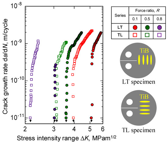 The rates of crack growth, da/dN for TL and LT specimens are plotted as functions of ΔK for R values of 0.1, 0.5, and 0.8 in Figure 4. In each data series, ΔKth is seen to decrease as R is increased while, in contrast, da/dN increases. In addition, the values of da/dN acquired using the LT specimens (in which the TiB whiskers were perpendicular to the crack growth) are always lower than the values observed using the TL samples at the same ΔK. Conversely, the ΔKth values of the LT series are always greater than those of the TL series. These findings indicate that fatigue crack propagation in TiB/Ti-3Al-2.5V composites under near-threshold conditions is affected by both the force ratio and the TiB orientation.