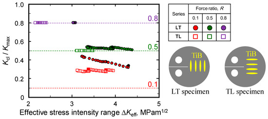 The effect of the force ratio in conjunction with near-threshold levels is typically ascribed to crack closure [47]. Consequently, this work examined the ΔKeff values for TiB/Ti-3Al-2.5V alloys having different TiB orientations. Figure 5 plots da/dN as a function of ΔKeff. For both data series, the data acquired at various force ratios coalesce into a single curve near the threshold at which R is less than 0.5. The ΔKeff,th values for the LT specimens were very similar, although the ΔKeff,th at R = 0.8 are slightly lower than those at R = 0.1 and 0.5. Boyce and Ritchie [48] have suggested a model based on superposition for investigating the rate of fatigue crack growth in titanium alloys, taking into account cracking due to mechanical fatigue and sustained load at high force ratios. Figure 5 also revealed that the ΔKeff,th at R = 0.8 for the LT specimens was much higher than that for the TL specimens. The orientation of the TiB whiskers also modifies the sustained load cracking in this alloy.