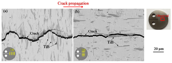The appearance of crack closure in association with near-threshold levels in titanium alloys is commonly ascribed to a roughness-induced process [49,50]. For this reason, the profiles of cracks generated in the present work were observed by SEM. Micrographs of crack profiles in both types of specimens with an R of 0.1, obtained using backscattered electron (BSE) imaging, are presented in Figure 7. The contrast in these images reflects the chemical composition of the material. Specifically, brighter contrast is associated with a higher atomic number. Therefore, the TiB showed up as darker than its surroundings. It is apparent that deflected and tortuous cracks were produced in the LT specimens to a greater extent than in the TL series. These results are attributed to the preferential propagation of cracks across boundaries between the TiB and the matrix in certain regions. In the case of the LT specimens, fatigue cracks were also found to propagate through the TiB.