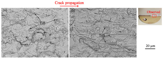 BSE images of fracture surfaces for both LT and TL specimens following testing with an R of 0.1 are provided in Figure 8. In these images, it is clear that TiB was present on the fractured surfaces of both materials. Ra, the arithmetic mean deviations for the fracture surfaces, were determined and the values were found to be greater for the LT specimen (11.1 versus 8.65 µm) as a result of the more convoluted crack path in this material. Both the present author [40] and Nalla et al. [51] have previously established that the relationship between structure and fatigue crack growth varies with the alloy microstructure. This effect increases the resistance of the alloy to the growth of fatigue cracks because of the roughness-induced crack closure. The path of cracks in a Ti-3Al-2.5V alloy reinforced with TiB is also affected by the orientation of the TiB. Thus, the fatigue threshold varies with the whisker orientation. For these reasons, deflected and tortuous cracks appeared in the LT specimen, which in turn enhanced the resistance to fatigue crack growth.