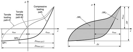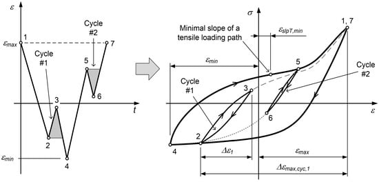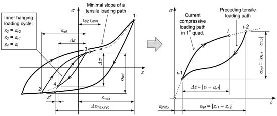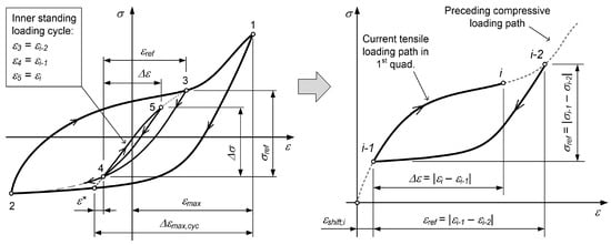 - For the inner loading cycles, part of which is also the tensile loading path, the rule of closed hysteresis loops must hold, as defined by Jayakumar [34]. In our case, this means that a strain shift must be determined for the inner tensile loading path to ensure that its model, which starts at the point , reaches exactly the point of the preceding compressive loading path . To calculate the strain shift , the tensile loading path is modelled in the first quadrant of the – space (see the right-hand diagram in Figure 4 (In general, the quantity is not equal to the quantity in Figure 4)).