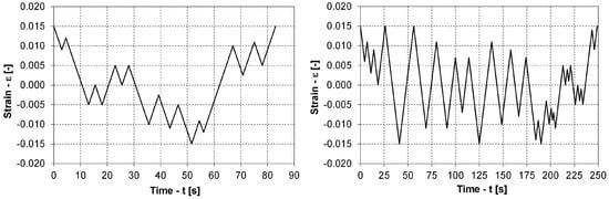 - Strain-controlled, variable, low-cycle fatigue experiments for two different strain time histories were performed, as presented in Figure 6. Altogether, two variable-load, low-cycle fatigue experiments were performed between the limit strains of and to validate the proposed model for predicting the low-cycle fatigue life of the magnesium alloy AZ31.