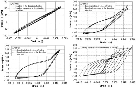 - Strain-controlled, fully reversal (), step-wise, low-cycle fatigue experiments with increasing strain amplitudes were performed until failure. At each strain amplitude level, 20 loading cycles were completed to stabilise the hysteresis loops. The initial strain amplitude was and the second strain amplitude level was . After that loading block, the strain–amplitude level was increased by in each of the next loading blocks. The step-wise test was terminated after the rupture of the specimen. The purpose of this test was to determine the shape of the closed hysteresis loops and the hardening rule (isotropic or kinematic). Altogether, five step-wise experiments were performed.