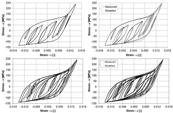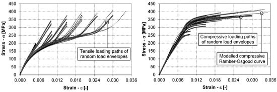 - The parameters of the Ramberg–Osgood relationship for the outermost compressive loading path that is modelled with Equation (3) should be determined either just for the highest strain amplitude loading level or for all the compressive loading paths from the domain of the kinematic hardening, i.e., in our case.