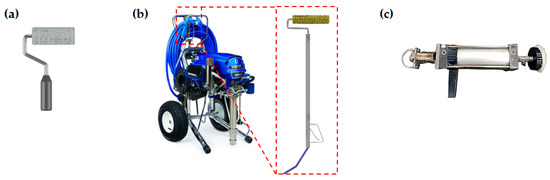 As shown in Figure 2, a conventional roller, electric airless sprayer, and portable gun-type applicator were selected as the coating equipment and labelled as control, E1, and E2, respectively. A conventional roller was defined as the control since it is one of the most common tools for underwater coating work. E1 is a commercially available electric airless texture sprayer (GRACO Mark V, GRACO Inc., Minneapolis, MN, US) that is generally used for the surface protection of ships and containers. E1 operates by sucking the coating liquid through its pump system and discharging it to a spray gun. E2 is a portable gun-type applicator based on a piston mechanism that was designed as part of this study. E2 consisted of a wool pad to apply the coating, a reservoir for the coating material, a coil spring, and a piston cylinder. The coating material was pumped to the wool pad from the reservoir by operating the piston cylinder. The coatings were applied underwater, then test pieces were immediately placed in a curing tank filled with water. It should also be noted that all the samples were prepared in underwater conditions.
