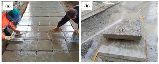 Figure 3. Concrete specimen casting and surface preparation procedure: (a) concrete substrate fabrication, and (b) water jetting to make a rough surface. - At 24 h after casting, the test pieces were demolded and placed in a steam curing chamber.