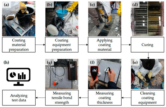 Coating, curing, and measurement process: (a) coating material preparation; (b) coating equipment preparation; (c) applying coating material; (d) curing; (e) cleaning; (f) coating thickness measurement; (g) bond strength measurement; (h) analyzing.