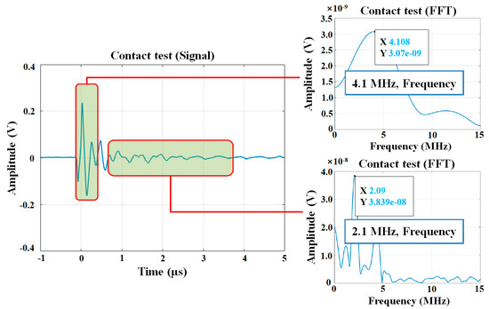 Coating thickness was measured using a concrete coating thickness gauge (Elcometer A500C-B, Elcometer, Manchester, England, UK, measurable thickness ranges from 0.15 to 2.50 mm) following the procedure of ASTM D6132 [28]. Prior to contacting a transducer to the specimen, an ultrasonic couplant gel was applied to the targeted location for effective ultrasonic wave propagation. Figure 5 shows the process of calibrating the ultrasonic gauge prior to measuring the coating thickness. Calibration foils of known thickness were used to obtain speed data. The average thickness was estimated from four points near the targeted location for bond strength measurements (Figure 4f). To evaluate the bond strength of each coating, the pull-off tension bond tests were performed in accordance with ASTM C1583 [29]. Equation (1) was used to calculate the pull-off bond strength: