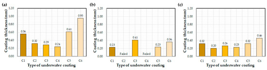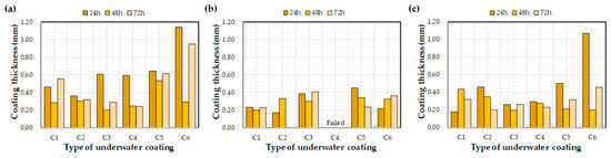 Figure 6 illustrates the effect of each coating on the measured coating thickness after curing underwater for 72 h. Thickness values varied greatly with the type of coating equipment utilized. Average thickness values were 0.95 mm, 0.36 mm, and 0.46 mm for the control, E1, and E2, respectively. The influence of coating materials on thickness was less obvious. The control C6 coating was thicker than those of C1–C5.