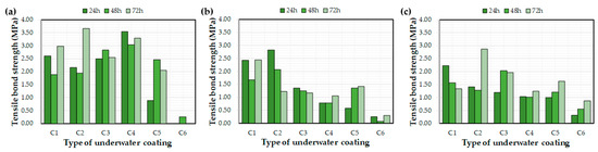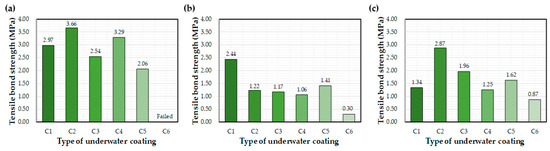 Figure 7 shows the effect of the different epoxy resins on the interfacial bond after 72 h of curing underwater. Average bond strength values (MPa) are recorded on the graphs. Bond strength varied depending on the type of coating equipment, with the highest values mainly attributed to the control. In general, C1 and C2 coatings exhibited the highest bond strengths. The C6 coating exhibited the worst bond performance, although bond strength improved when applied using the E1 and E2 equipment. The C1 and C2 bond strengths obtained in a previous study were 32% and 33% lower, respectively, than that obtained in this study [27]. This change in performance may be related to differences in the coating device and environmental conditions, such as temperature and humidity.