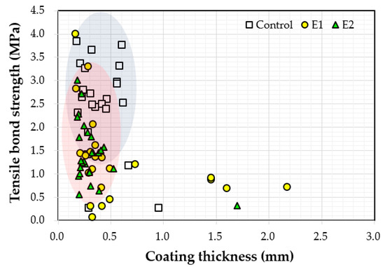 - The bond strength values ranged between 0.1 MPa and 4.0 MPa when coating thickness values were less than 0.8 mm, and the bond strength tended to decrease with increasing coating thickness.