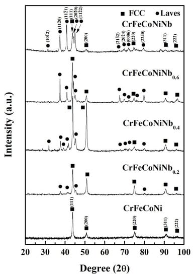 - The CrFeCoNi alloy had an fcc granular structure. The microstructures became dual-phased dendritic microstructures after adding niobium. The CrFeCoNiNb0.2 and CrFeCoNiNb0.4 alloys were hypereutectic alloys; their dendrites were fcc phases, and the interdendrites were eutectic structures of fcc and Laves phases (hcp). The CrFeCoNiNb0.6 and CrFeCoNiNb alloys were hypoeutectic alloys; their dendrites were a Laves phase, and the interdendrites were still eutectic structures of fcc and Laves phases.