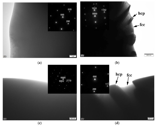 Figure 3 shows the TEM bright field (BF) images to examine the phases of the CrFrCoNiNbx alloys, and the inserts are their corresponding select area diffraction patterns (SADs). Figure 3a is an image of the dendrite of CrFrCoNiNb0.4 alloy. The corresponding SAD proves that the dendrite is an fcc phase. Figure 3b is an image of the interdendrite of CrFrCoNiNb0.4 alloy, and the corresponding SAD was taken from the Laves phase in the interdendrite. Figure 3c is an image of the dendrite of CrFrCoNiNb0.6 alloy. The corresponding SAD proves that the dendrite is a Laves phase (hcp structure). Figure 3d shows the image of the interdendrite of CrFrCoNiNb0.6 alloy, and the corresponding SAD was taken from the fcc phase in the interdendrite of CrFrCoNiNb0.6 alloy. Therefore, Figure 3 indicates that the CrFeCoNiNb0.4 alloy is a hypoeutectic alloy and that the dendrites of this alloy are an fcc phase; the CrFeCoNiNb0.6 alloy is a hypereutectic alloy, and the dendrites of the alloy are the Laves phase. In all of these alloys, the interdendrites are a dual-phased (fcc and Laves phase) eutectic structure. Chanda and Das [14] also pointed out that the Nb-content of eutectic CrFeCoNiNbx alloy should be located between 0.5 and 0.55.