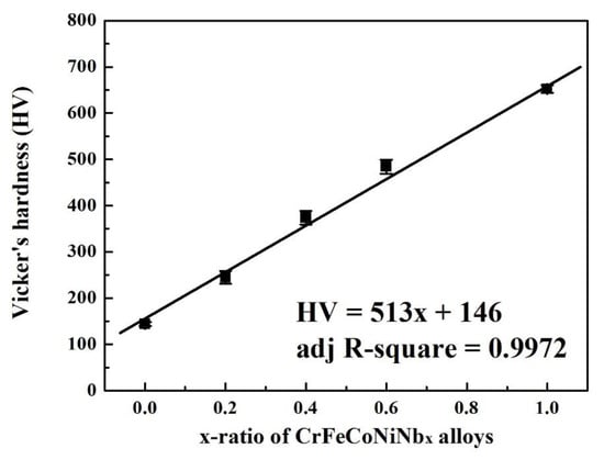 Referring to our previous studies, CrFeCoNi alloy has an fcc granular structure, and some hcp Cr-rich precipitates are in the matrix [12]; it has a good corrosion resistance in 1 M deaerated sulfuric acid and 1 M deaerated sodium chloride solutions. However, the CrFeCoNi alloy is very soft, which limits its application. The hardness of CrFeCoNi alloy could be enhanced after the adding of Nb [13]. The corrosion resistance of CrFeCoNiNb alloy slightly decreases in comparison with that of CrFeCoNi alloy, but it is still better than that of commercial 304 stainless steel. The microstructures and mechanical properties of CrFeCoNiNbx alloys are also investigated because of their high performance for commercial applications [14,15,16]. This study investigates the microstructures, hardness, and corrosion behaviors of CrFeCoNiNbx (x = 0–1) alloys.