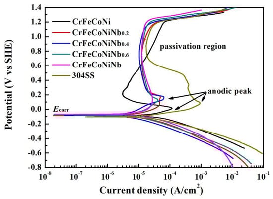 The polarization curves of CrFeCoNiNbx alloys and 304SS in 1 M deaerated H2SO4 solution are shown in Figure 5, and Table 4 lists the polarization data of the alloys. The values of free corrosion potential (Ecorr) of these alloys are close. Increasing the Nb-content of CrFeCoNiNbx alloys resulted in slightly increasing the Ecorr of the alloys. The free corrosion current density (icorr) varied randomly in these alloys, because the microstructures and the fractions of the phases in the alloys changed significantly. The CrFeCoNiNb0.6 alloy had the lowest icorr among these alloys. In addition, increasing the Nb-content of CrFeCoNiNbx alloys resulted in decreasing the anodic peaks of these alloys. The 304 stainless steel had the largest anodic peak among these alloys, and the CrFeCoNiNb alloy had the smallest anodic peak. The largest current density (icrit) and the potential (Epp) of the anodic peak of each alloy are listed in Table 4. Therefore, the CrFeCoNiNb alloy entered the passivation region more easily than the other alloy in this solution. Moreover, adding Nb could stabilize the passivation region of CrFeCoNiNbx alloys. The passivation regions of these alloys broke down at potentials of about 1.2 VSHE because of an oxygen evolution reaction [19]. All of the passivation regions of CrFeCoNiNbx alloys were broader than that of 304SS.