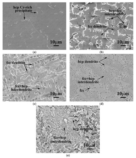 The SEM microstructures of as-cast CrFeCoNiNbx alloys, (a) CrFeCoNi; (b) CrFeCoNiNb0.2; (c) CrFeCoNiNb0.4; (d) CrFeCoNiNb0.6; and (e) CrFeCoNiNb alloys.