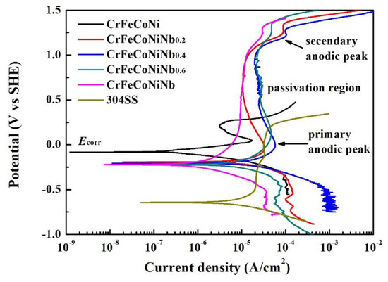 The polarization curves of CrFeCoNiNbx alloys and 304SS in 1 M deaerated NaCl solution are shown in Figure 7, and Table 5 lists the polarization data of the alloys. The values of Ecorr of CrFeCoNiNbx alloys were very close; they are nobler than that of 304SS, but more active than that of CrFeCoNi alloy. The values of icorr of CrFeCoNiNbx alloys were all higher than that of CrFeCoNi alloy. The icorr of CrFeCoNiNb0.6 alloy had the highest value. The CrFeCoNiNb0.2 and CrFeCoNiNb alloys had smaller icorr, and their values were almost the same as that of 304SS. The primary anodic peak of CrFeCoNi alloy was significant, but increasing the Nb-content of CrFeCoNiNbx alloys would diminish the anodic peaks of these alloys. Therefore, the CrFeCoNiNb alloy had no anodic peak. Moreover, adding Nb could expand the passivation regions of CrFeCoNiNbx alloys.